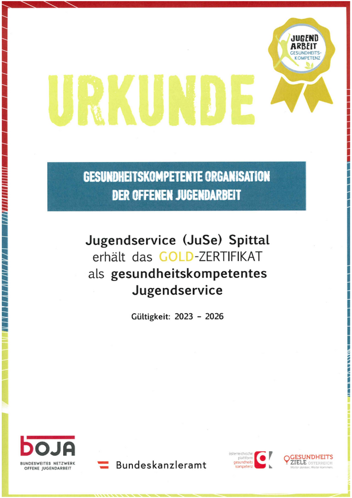Nach einem erfolgreichen Rezertifizierungsprozess wurde uns am 23. Dezember 2023 die Auszeichnung für gesundheitskompetente Jugendarbeit auf Gold-Level überreicht.
